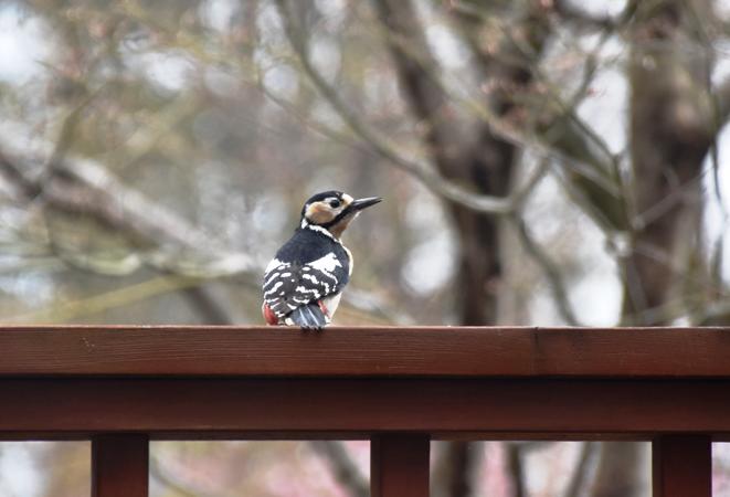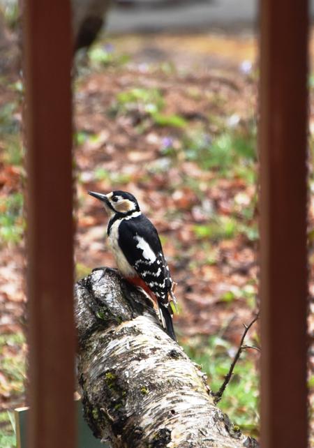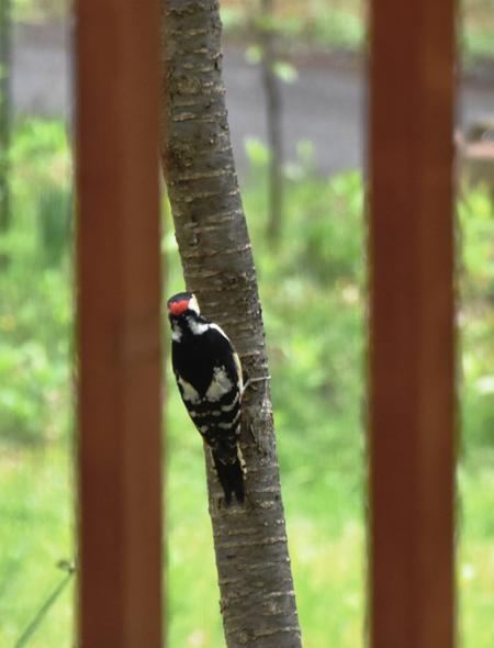 アカゲラ キツツキです。全長24センチほどで大きい部類に入ります。日本の低地から亜高山にかけ生息する留鳥で、頭から背、翼の上面、尾は黒色で、翼には小さな白斑が集まった