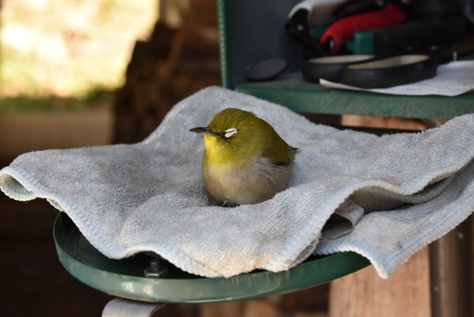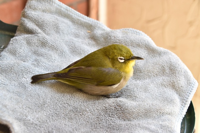メジロ スズメより小さく、上面が緑っぽく目のまわりが白いです。全長:12cmほど常緑広葉樹林を好み、北海道や山地では秋冬に暖地や低地に移動するそうです。この時は、我が家の窓ガラスに激突し脳しんとうを起こしていたので、救助しました。後元気に飛びたっていきました。