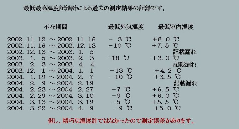 | 更には、不凍液を各所に注入するなどで、環境的にも問題があると思われます。 また、別荘ですので、薪ストーブを使用している方々も多いのですが、別荘で週末や祭日しか利用出来ないものにとって、金曜日の仕事を終え、夜現地八ヶ岳富士見高原に到着したときなど、屋内でも氷点下−10℃になっていることもまれではなく、薪ストーブ用の薪自身が凍結していて、焚くことが困難な状況でさえあります。 そこでやむなく、家が暖まるまでの間車の中にいるか到着時間が早ければ温泉に行って、その間ストーブを焚き住宅を暖めておきます。 また水通しの作業をしないとトイレも使用できません。 便器を電気毛布に包んで強制的に温める方法やドライヤーを駆使して使用できるようにするそうです。 水道のカランを外して東京に持ち帰る方もいて、毎回水道工事状態ですとのお話しも聞いています。 このような苦労話は枚挙に暇がありませんが、寒冷地でも簡単に使用できる住宅システムがなぜローコストで出来ないものなのか不思議でなりませんでした。 そこで、ちょっとした工夫によって、住宅自身が氷点下まで下がらない仕様の住宅を考案し、3年間冬期間の屋内外の温度測定を行い、最低外気温度が−18℃の時でも、屋内は+3℃までしか下がらないことが実証されました。 |