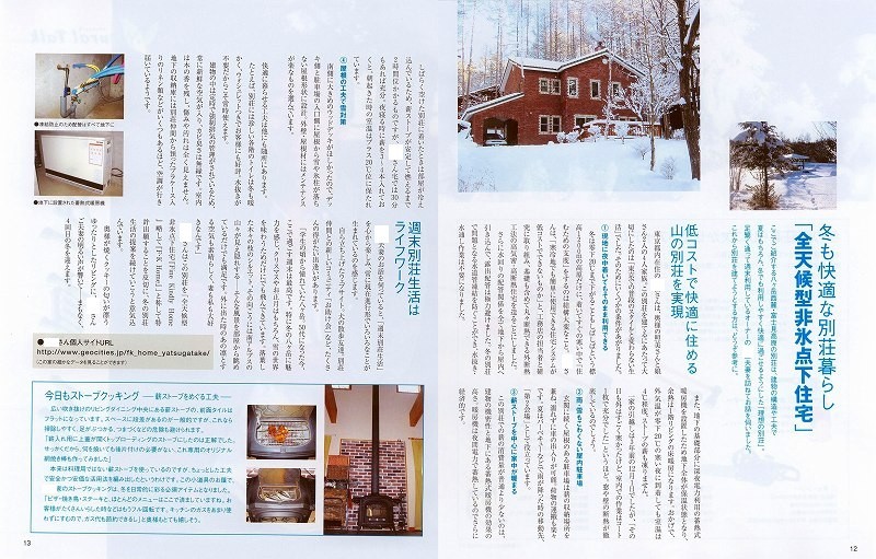 八ヶ岳富士見高原F・K Home・全天候型非氷点下住宅が月刊誌「リゾート物件情報」山の冬支度特集に掲載されました。 8月28日(日)に取材に訪れた月刊リゾート物件情報誌のスタッフのみなさんありがとうございました。 全天候型非氷点下住宅の氷点下にならない住宅の素晴らしさを評価して頂いて感謝しています。八ヶ岳の冬は本当に気持ちの良い素晴らしい季節感を味わせてくれます。凛とする空気の美味しさは格別です。 全天候型非氷点下住宅は、冬の八ヶ岳を気軽に楽しめる「人に優しく」「環境にもやさしい」Fine Kindly Home(やさしくやさしいお家)です。 ライターのコメントが素晴らしく、照れてしまいますが、寒冷地仕様の住宅・別荘で水抜き不要の暖かな楽しい住まいの提案です。 |