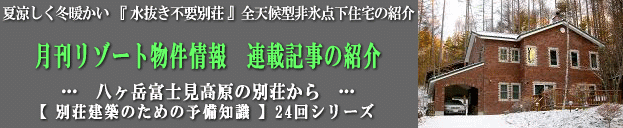 2006.7月号 両開2ページ掲載 (2006.6.5発売) 「別荘建築のための予備知識・八ヶ岳富士見高原の別荘から」 タイトル 第6回 「 水抜き不要住宅は水通し不要住宅 」 サブタイトル 「冬の別荘利用を拒む水道管凍結の問題」 「別荘オーナーは四苦八苦、水通し作業の状況と工夫」 「室温が0℃以上ならば水抜き作業は不要」 をお伝えしています。 |